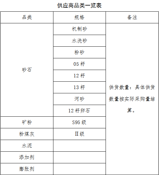 本次征集活動(dòng)為2025年度第二次原材料供應(yīng)商的征集,征集供應(yīng)商品類為:砂石、水泥、粉煤灰、礦粉、膨脹劑、減水劑、外加劑等,現(xiàn)每年總需求約200萬(wàn)噸。