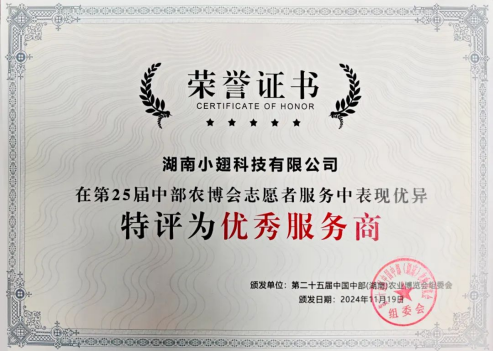 2024年5月,“小翅俠”志愿者服務(wù)團隊首次在2024年“機甲大師超級對抗賽上”亮相,獲得了主辦方、指導(dǎo)單位及政府對“小翅俠”志愿者服務(wù)團隊優(yōu)質(zhì)服務(wù)的高度認可與贊譽。2024年11月,“小翅俠”志愿者服務(wù)團隊亮相“第25屆中國中部(湖南)農(nóng)業(yè)博覽會”,再次以優(yōu)質(zhì)服務(wù)獲得了各方的高度認可與贊譽,并被組委會評選為“優(yōu)秀服務(wù)商”的榮譽稱號。這不僅是對“小翅俠”志愿者團隊的肯定,更是對志愿者們青春擔當?shù)恼J可。